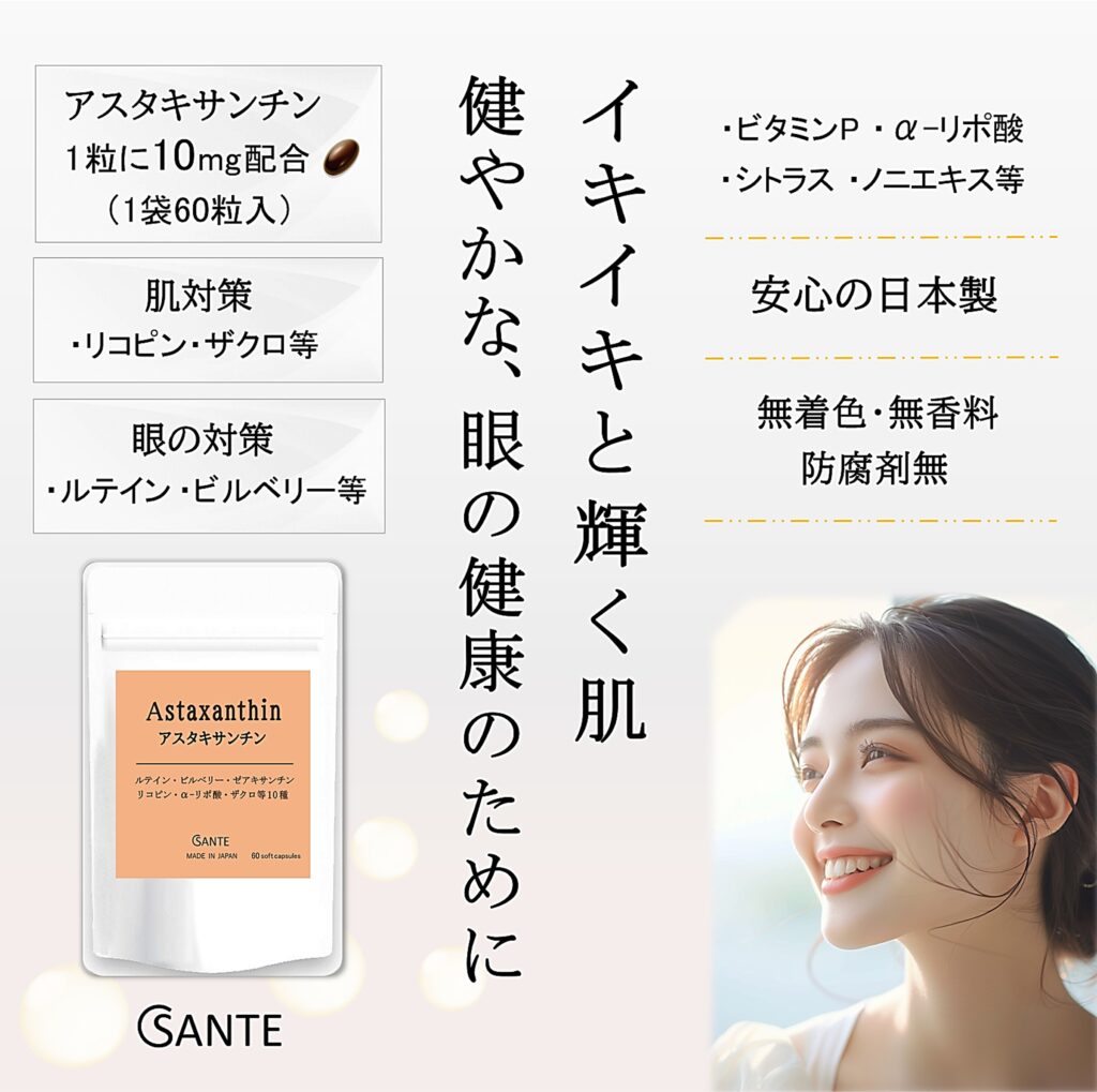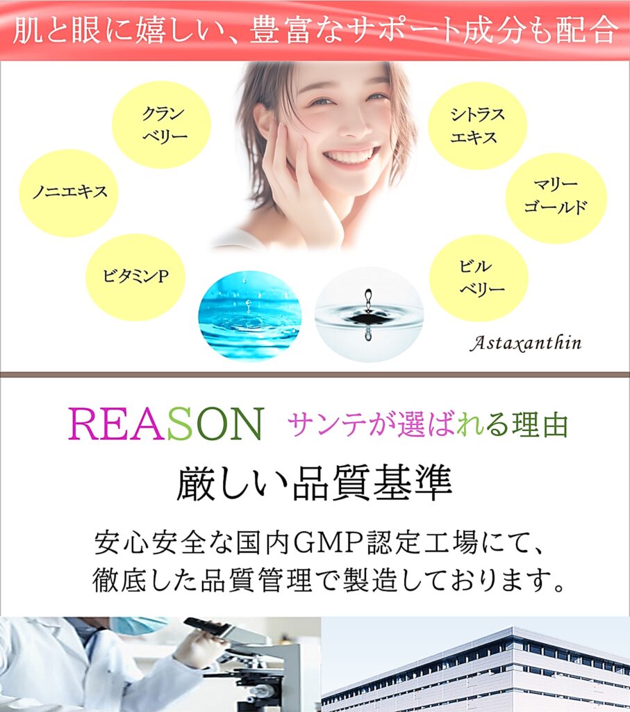 - 日本サンテのアスタキサンチンサプリは、クランベリーエキス・ノニエキス・ビタミンP、シトラスエキス、マリーゴールド等、肌と眼に嬉しいサポート成分も配合したオールインワンサプリ。
