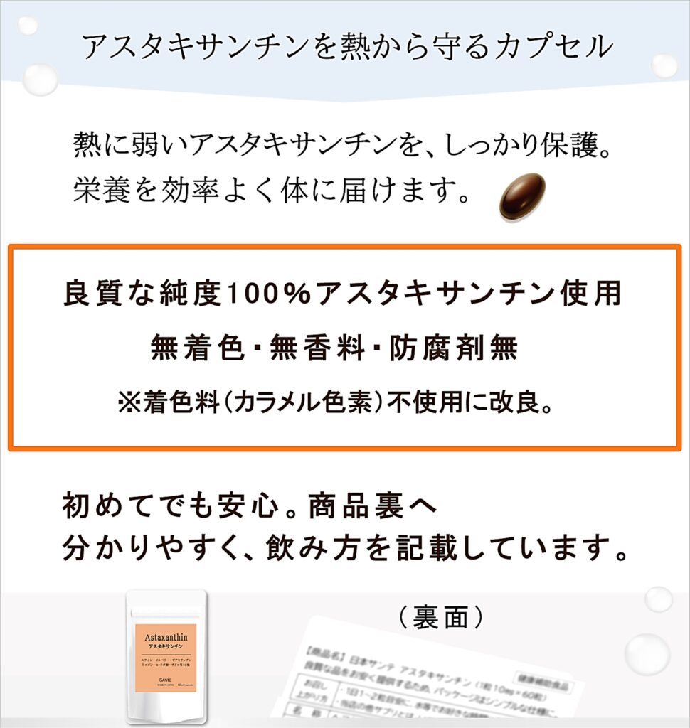 - 日本サンテのアスタキサンチンサプリは、無着色・無香料・防腐剤無。余計な添加物は入れていません。