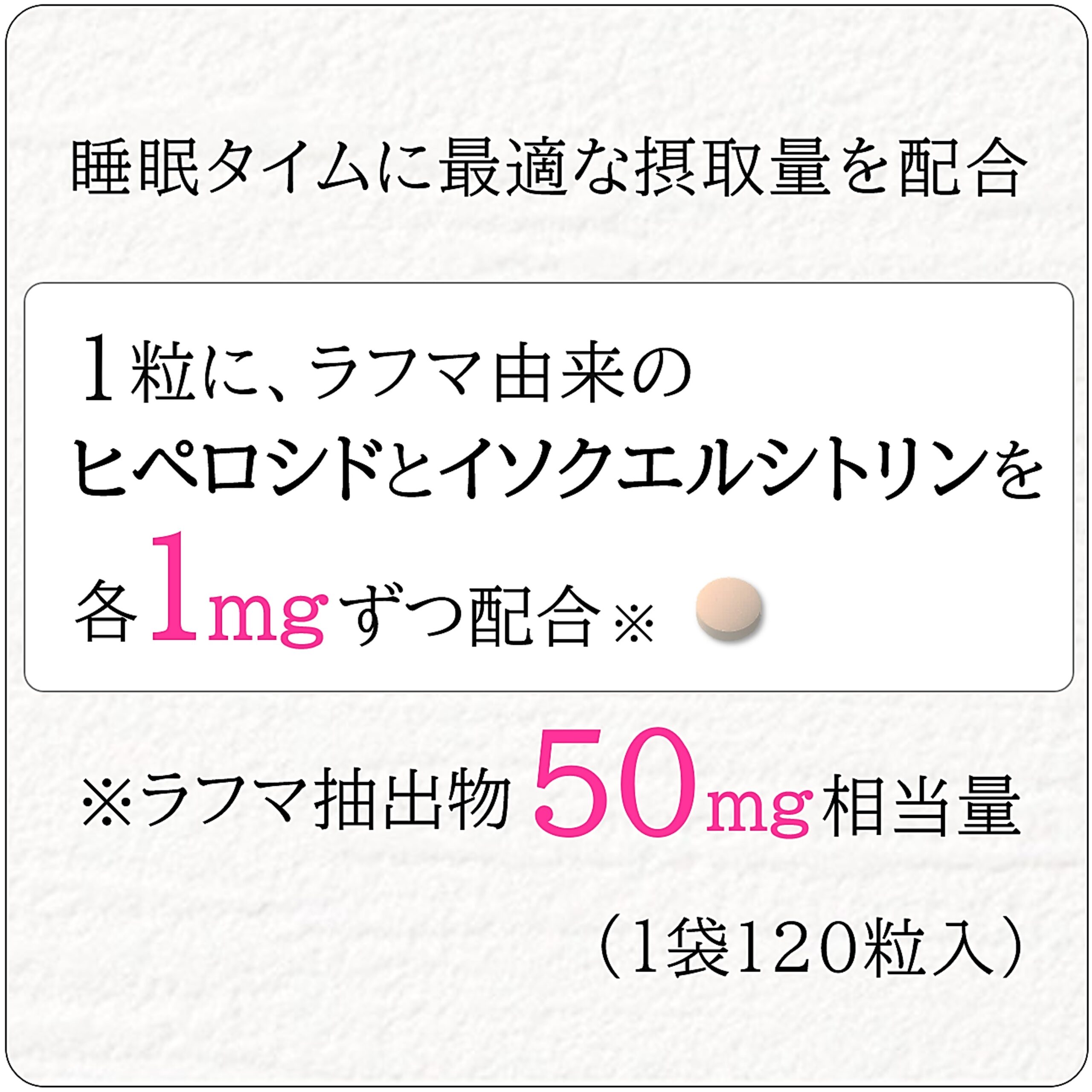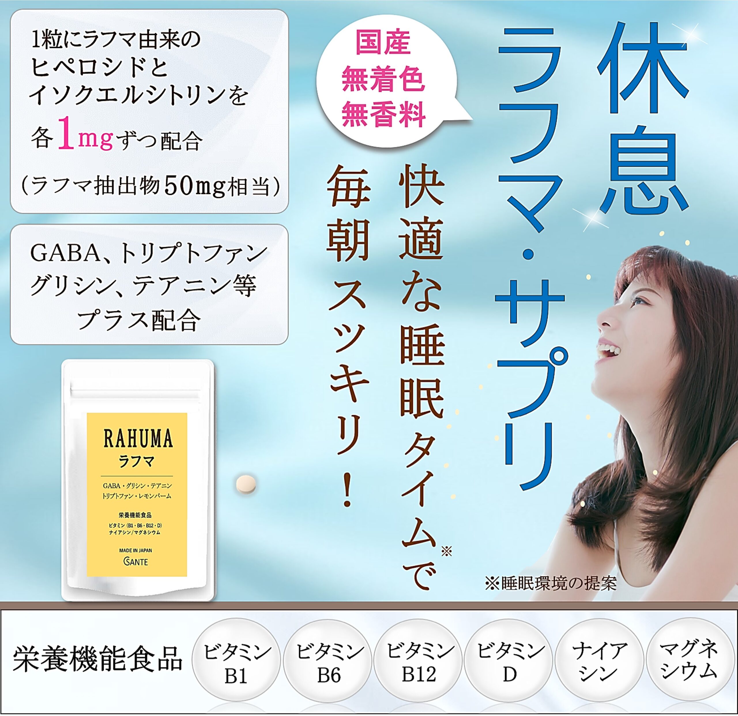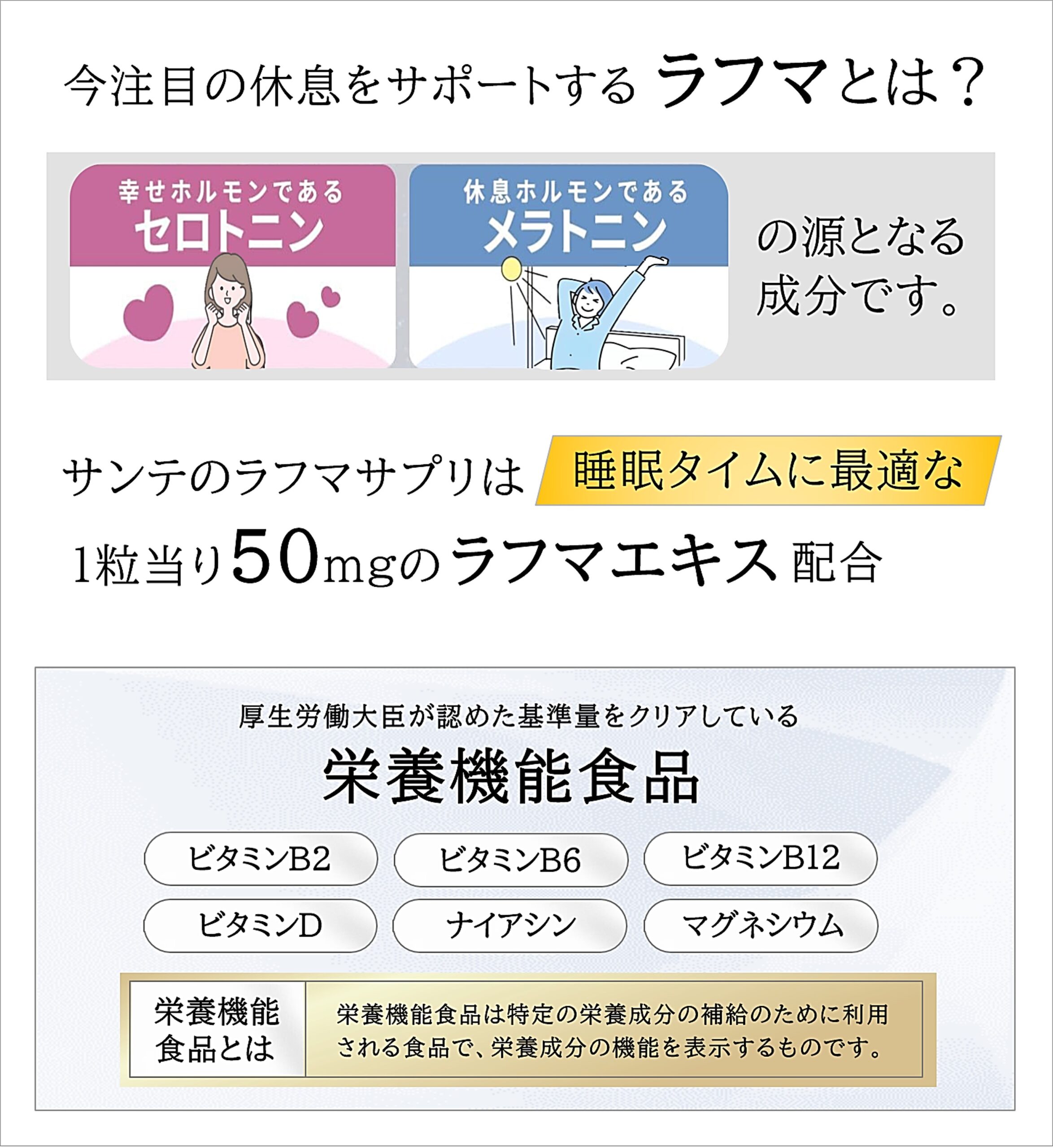 - 日本サンテのラフマサプリは、睡眠タイムに最適な1粒あたりにラフマエキスを50mg配合。(ラフマ由来のヒペロシドとイソクエルシトリン各1mg)
