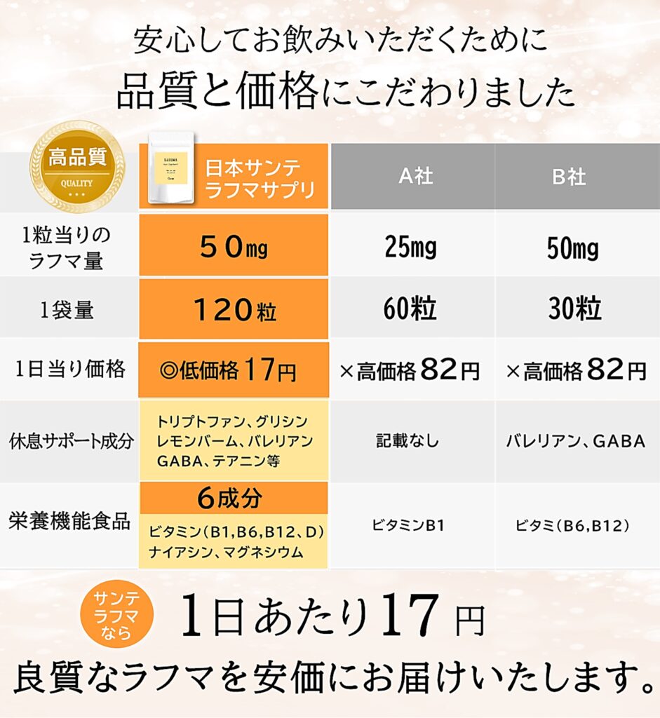 - 日本サンテのラフマサプリは、毎日お飲み頂くものだからこそ、コストパフォーマンスにもこだわりました。(ラフマ1粒50mgで1日あたり17円)